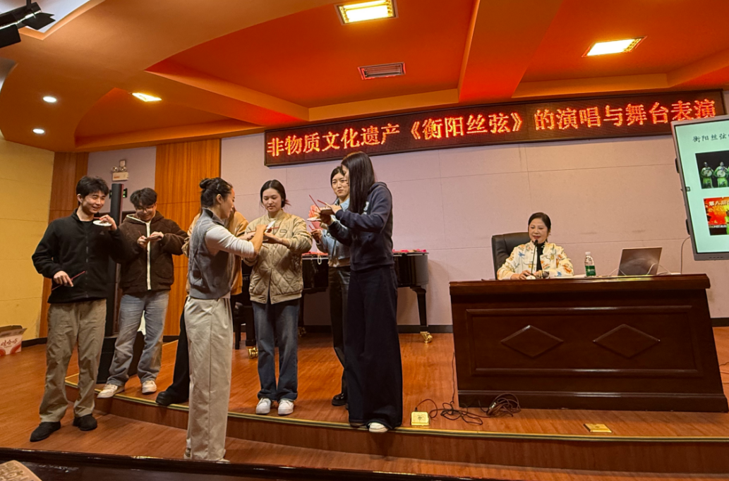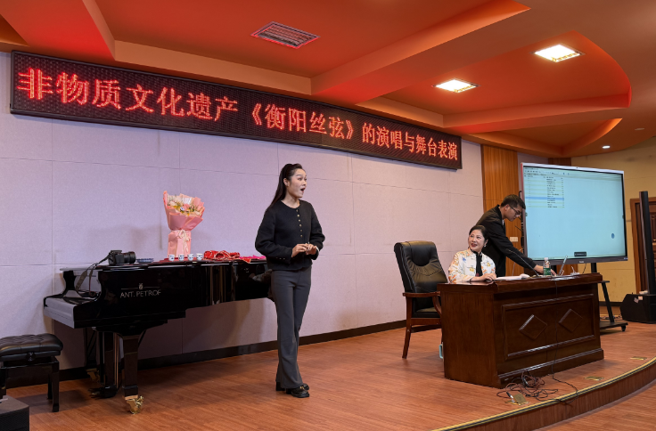 为了让同学们有身临其境的切身体验与感受,江老师与特邀的衡阳市歌舞剧团演员刘晶现场合作表演了衡阳丝弦《四季花儿开》。