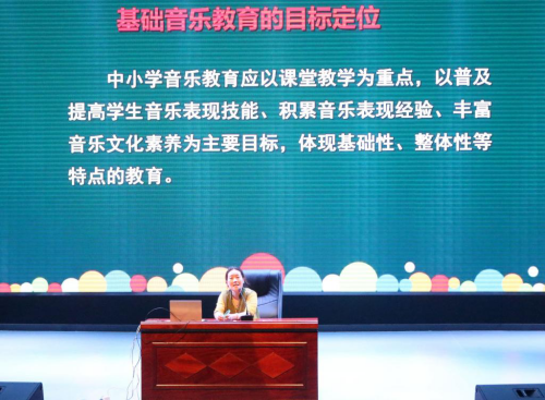 上午10:30,湖南省教科院音乐教研员薛晖在演艺厅作了题为“中小学音乐教学的目标定位及实施策略”的学术讲座。她强调中小学音乐教育应以课堂教学为重点,以普及提高员工音乐表演技能、积累音乐表现经验、丰富音乐文化素养为主要目标,并结合自己多年的音乐教学经验,阐述了中小学音乐教师应具备的基础音乐技能和音乐素养。