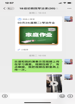 2、利用学习通、钉钉、班级小管家等平台对基础钢琴生及初教院员工进行在线教学及回课检查。