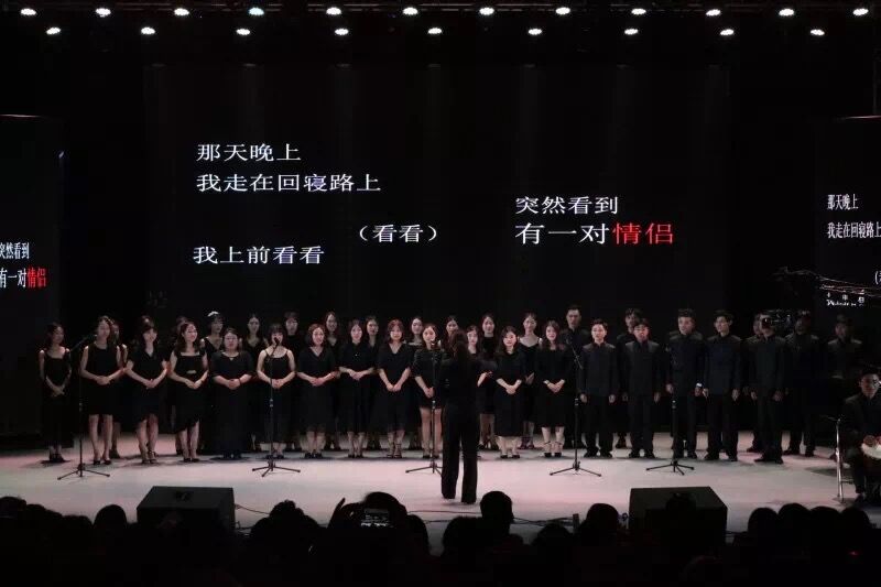 神秘小嘉宾的出现把晚会气氛推向高潮,萌萌的姿态加上甜甜的歌声,足以让现场的观众不自觉的嘴角上扬。一首由15级学一班的同学结合日常生活改编歌词的合唱歌曲,诙谐幽默地讲述了生活中的小片段,演唱过程中卡祖笛的加入更是出其不意,增强了合唱的趣味性。