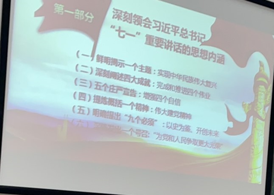 课程开始,谢书记指出“七一”讲话精神对于我国的重要性,它为全党全国各族人民向第二个百年奋斗目标迈进提供了根本遵循、指明了前进方向。谢老师强调,“七一”讲话精神对于党员是一笔宝贵的财富,要求同学们认真学习会议精神,不断提高自己的思想觉悟。