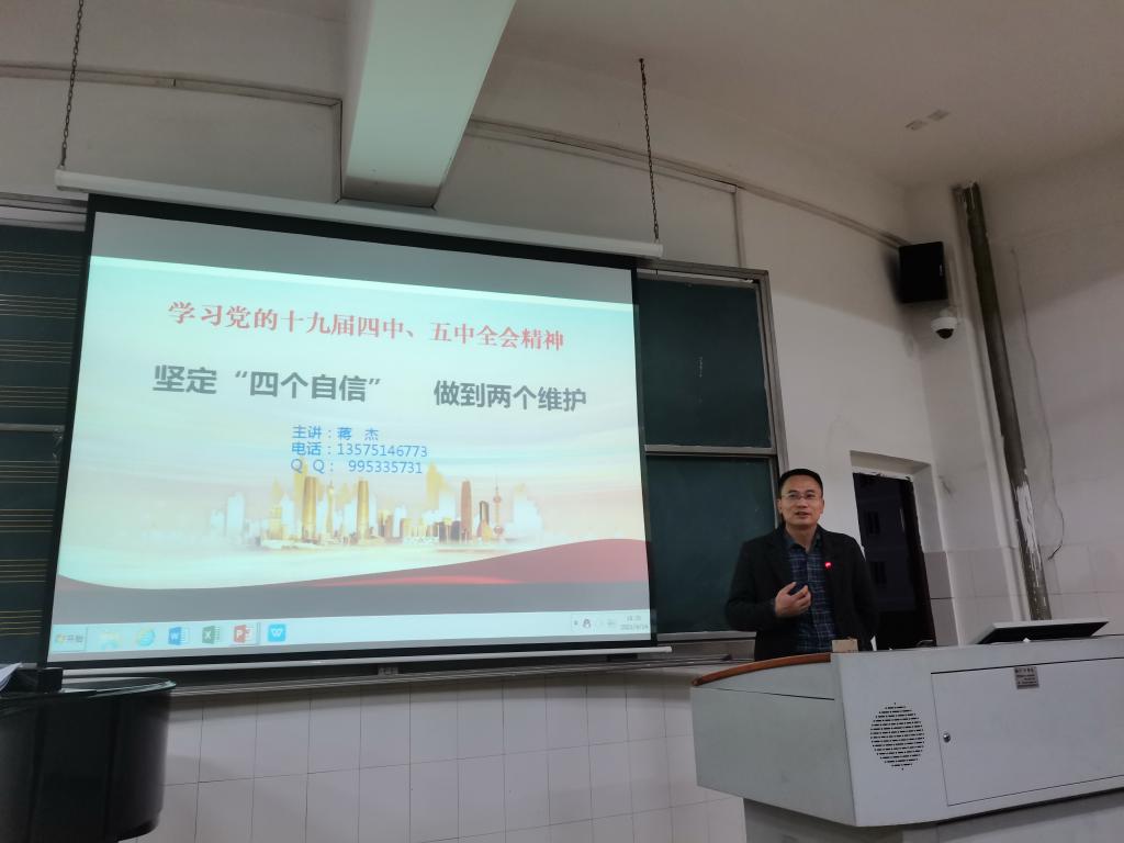 2021年4月14日晚19点30分,公司于音乐楼201教室举行了第63期入党积极分子培训班第七讲——学习党的第十九届四中全会、五中全会精神,增强“四个自信”,做到“两个维护”。本次培训由员工工作处处长蒋杰同志主讲。