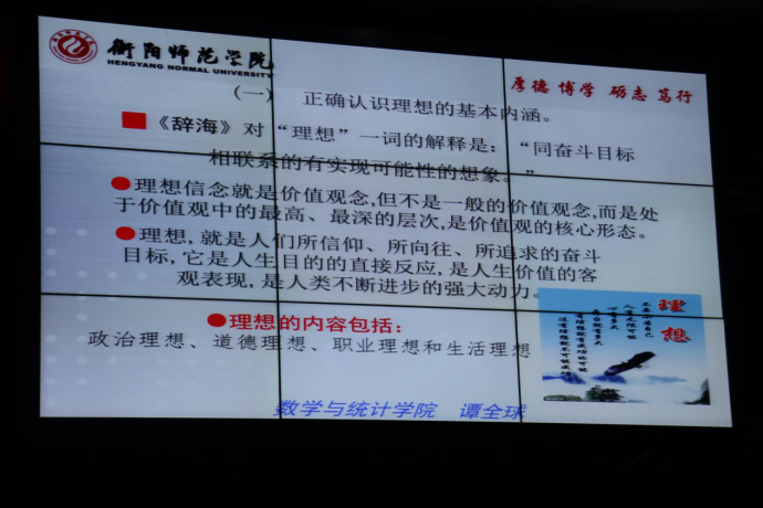 会议开始,谭书记和同学们从“理想”这一话题说起。他告诉同学们要正确认识理想的基本内涵。谭书记认为,理想有可能性,时代性。理想就是人们所信仰、所向往、所追求的奋斗目标。同时,理想也是人生目的的直接反应,也是人生价值的客观表现,更是人类不断进步的强大动力。