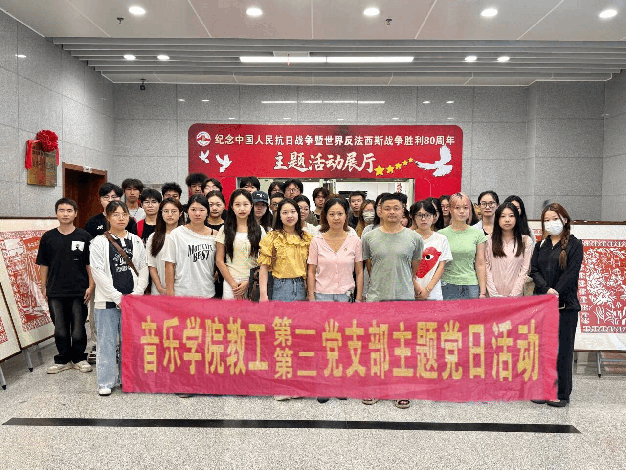 全体观战党员在抗战主题剪纸展前合影留念
